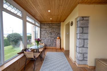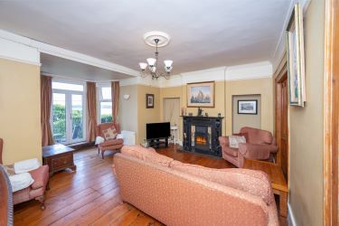 Wood Floor, Feature Marble Fireplace with Tile Insert, Bay Window, Connecting Doors to Dining Room, Door to Outside Seating Area, Radiator, Curtains, Power Points.