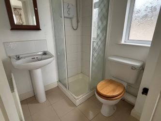 Ceramic Tiled, W.C., W.H.B, Bath with Electric Shower, Part Tiled.