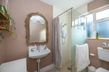 Ceramic Tiled Floor, W.C., W.H.B, Electric Shower Unit, Radiator, Part Tiled.